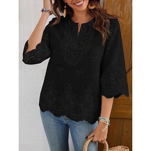 Per donna Blusa Tinta unica Elegante Casual Manica 3/4 Scollo a V Top Regolari Quotidiano Pizzo Nero Bianco Estate Primavera Autunno