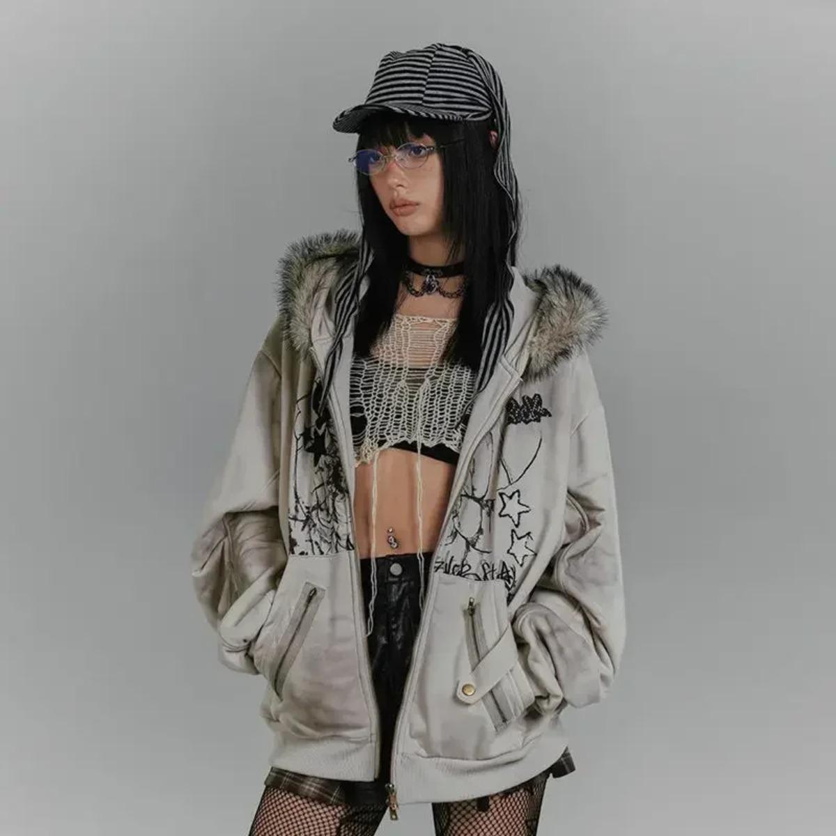 2KWEIRD American Retro Hoodie Women Gothic Simple Print Rabbit Ears Zipper Hooded Fur Collar Sweatshirt Fashionable Harajuku Jacket Tops cm