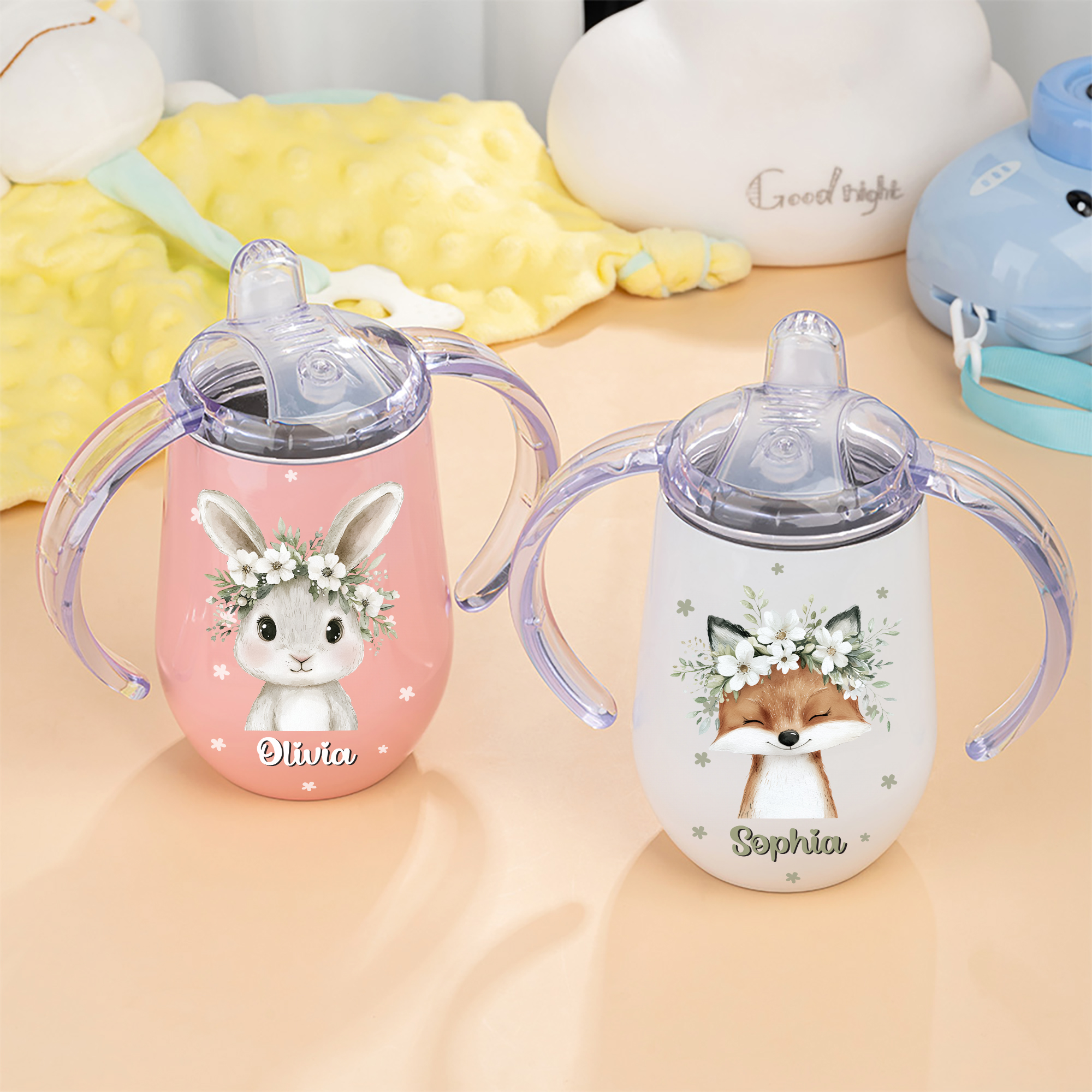 Tazza termica isolata da 10 oz con nome e manico, personalizzata con motivo animale a ghirlanda e regalo di compleanno per bambini