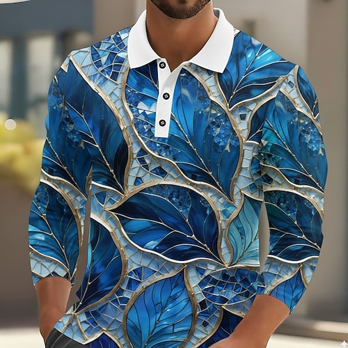 Per uomo Foglia Astratto Polo Manica Lunga Magliette polo Bavero Casual All'aperto Streetwear Athleisure Abbigliamento quotidiano Stampa 3D Bottoni Primavera Autunno Inverno Blu Viola Verde