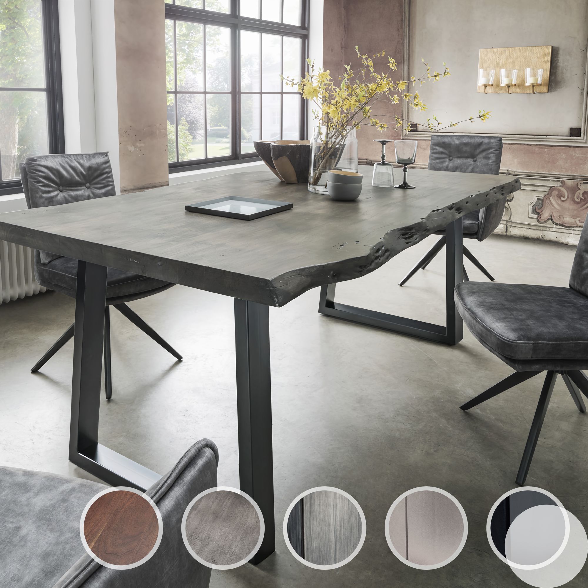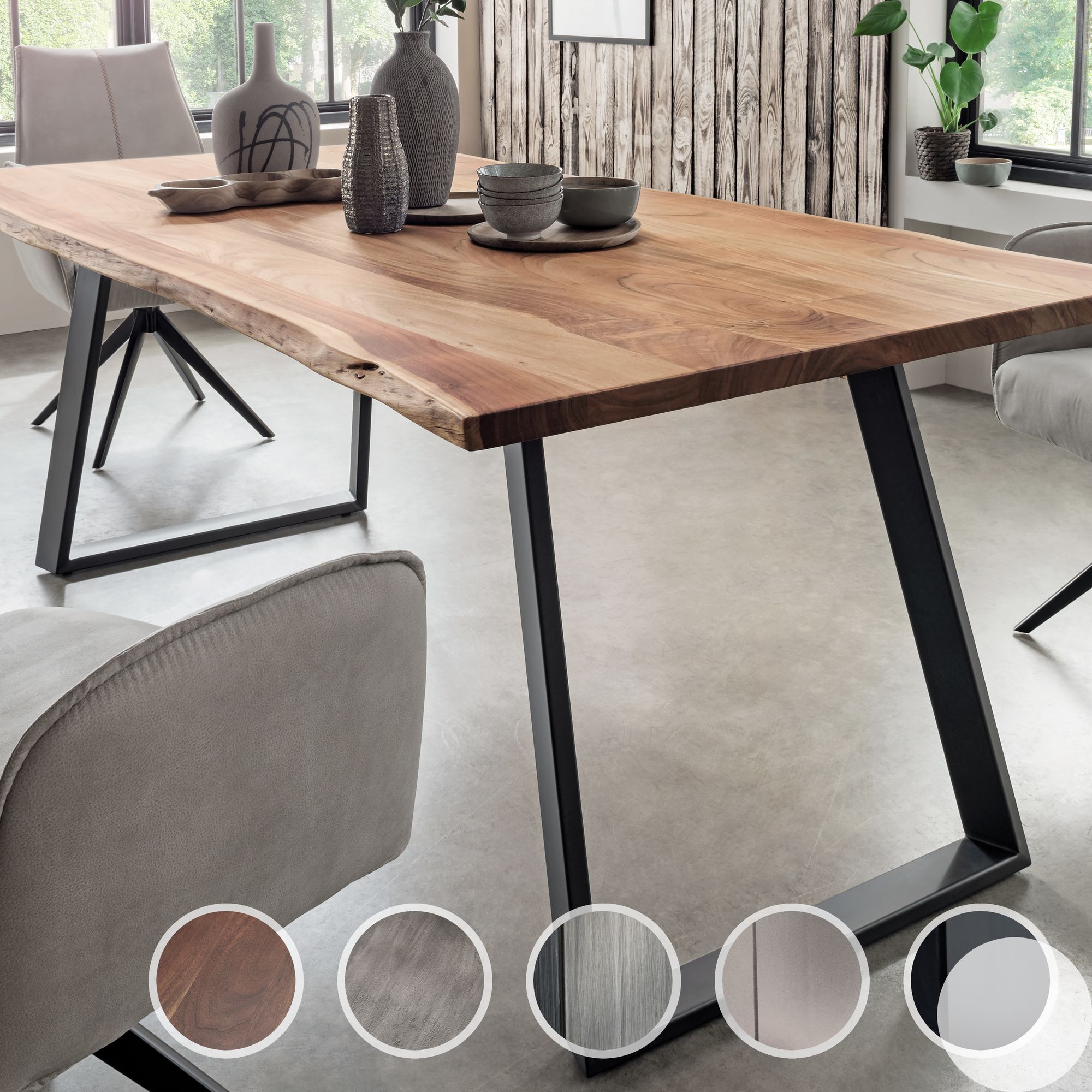 Essgruppe SALESFEVER, grün (walnuss, grün, schwarz, grün, schwarz), Strukturstoff, Esstisch Nussbaum, Esszimmerstuhl grün-90, Massivholz, Polyester, Metall, Sitzmöbel-Sets, Tischplatte behandelt mit OSMO Hartwachs-Öl in seidenmattem Finish