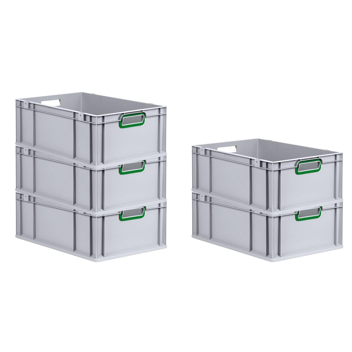 PROREGAL SparSet 5x Eurobox NextGen Color, HxBxT 22x30x40cm, 20 Liter, Griffe grün offen, Grau, Eurobehälter, Box, Transportbehälter