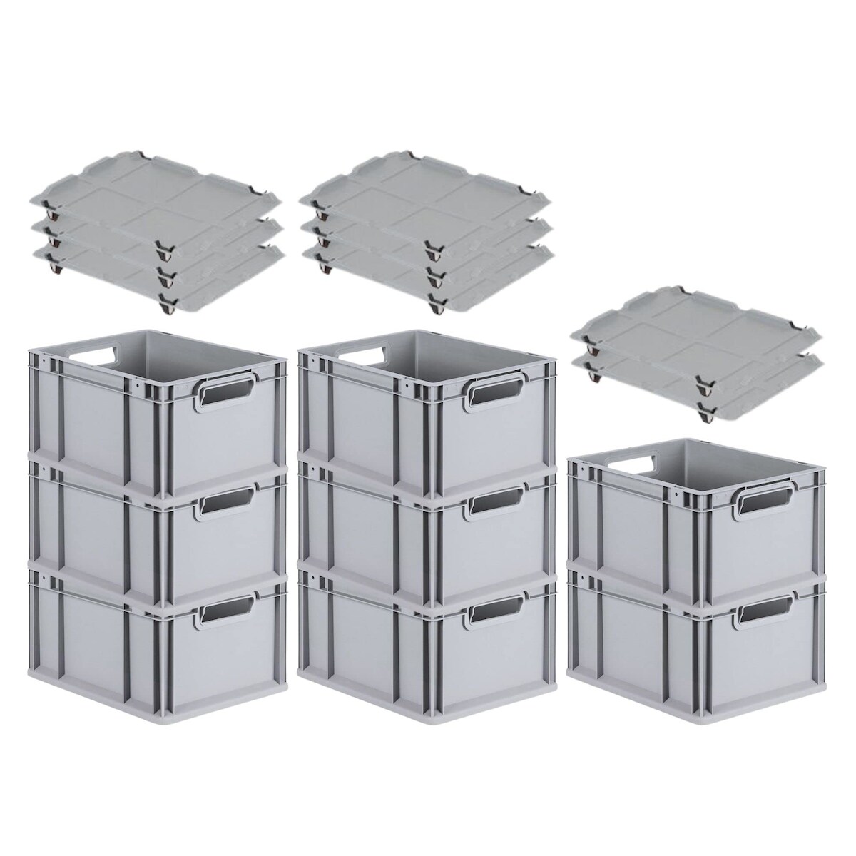 PROREGAL SuperSparSet 8x Eurobox NextGen Economy mit Auflagedeckel & 4x Verschlüsse Schwarz, Griffe offen, HxBxT 22x30x40cm, 20L, Eurobehälter, Box