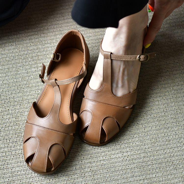 New thick heel hollow Mary Jane shoes college style platform high heels versatile soft leather round head one word buckle belt women's shoes cm brown