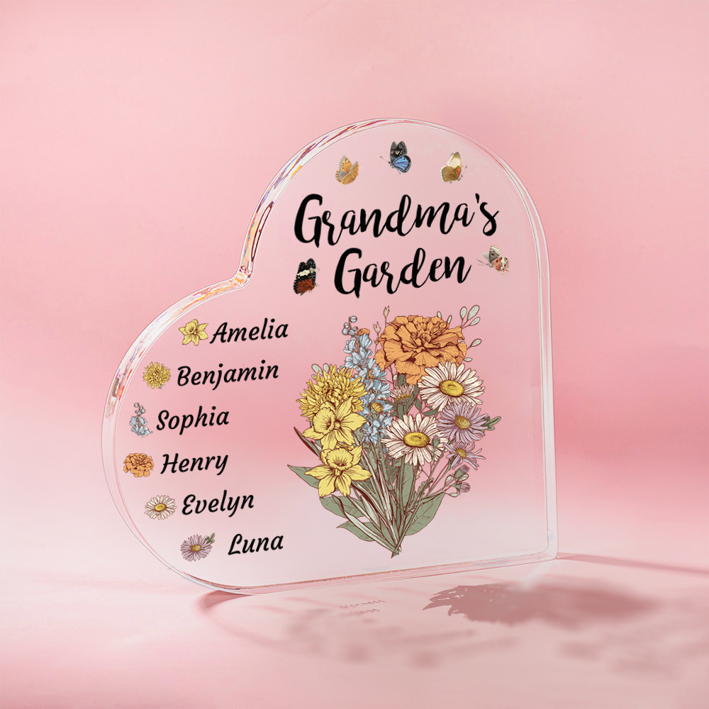 Targa in acrilico con nome e cognome per il compleanno e la festa della mamma: bouquet di fiori di nascita personalizzato a forma di cuore.