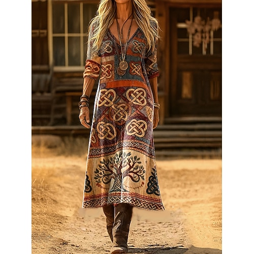 Per donna Abito maxi Tubino Festa Casual Boho Quotidiano Data Uscire Vestibilità regolare Grafico Geometrico Paisley Manica Lunga Scollo a V Marrone Scuro Primavera Autunno Inverno