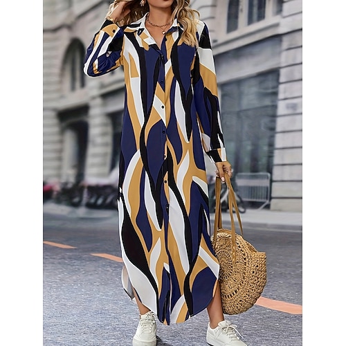 Per donna Abito maxi Abito a Tubino Casual Quotidiano Data Vestibilità regolare Grafico Geometrico Manica Lunga Colletto a Camicia Giallo Blu Verde Estate Primavera Autunno