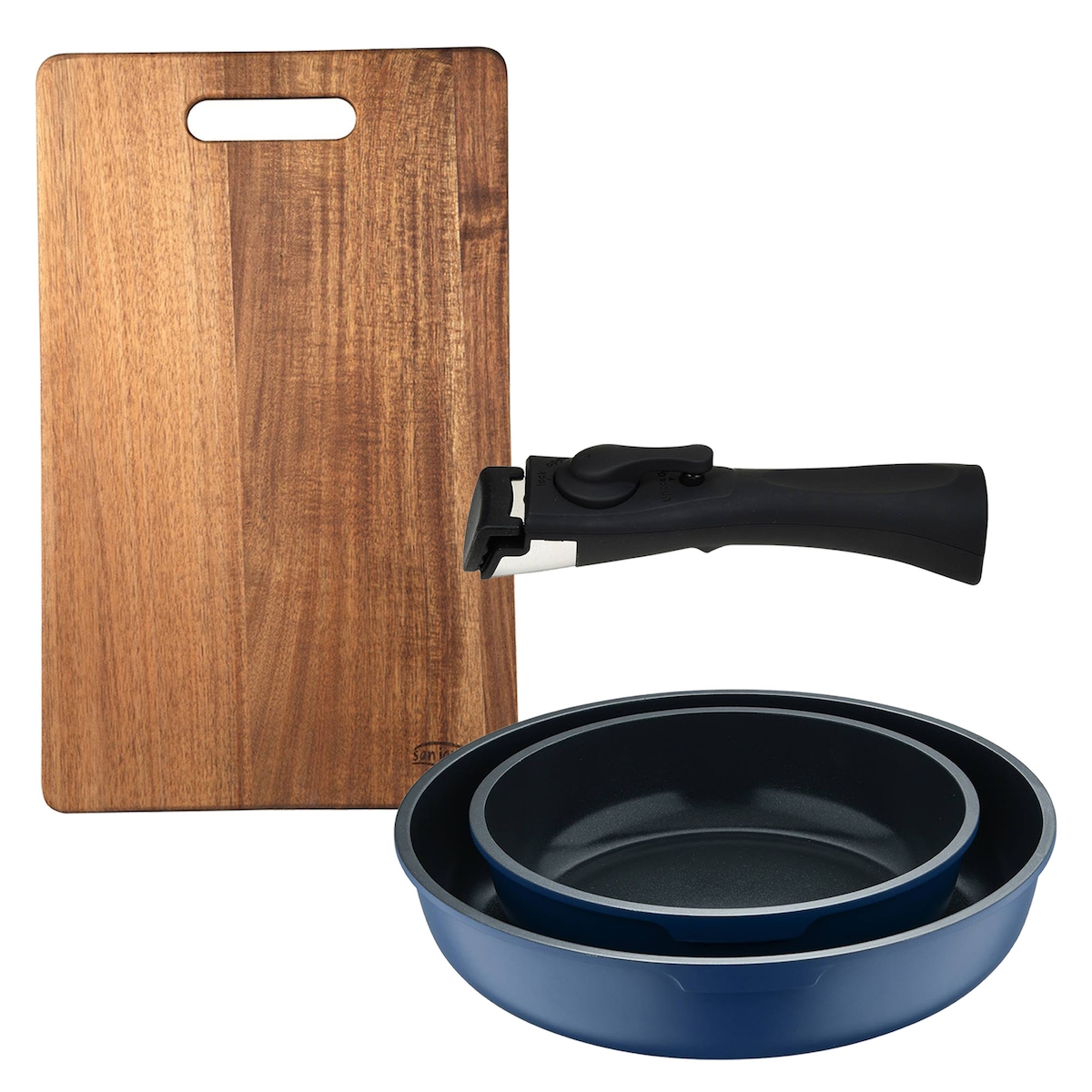 BERGNER - Set mit 2 Bratpfannen Ø22/26cm aus Aluminiumguss, blau, mit abnehmbarem Griff mit Schneidebrett 40,3x25,2x2,5 cm aus Holz