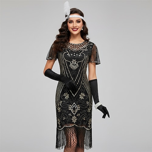 Set Anni Ruggenti Anni 1920 Abito da cocktail Lunghezza alla caviglia Vestito Abiti Abito da Ballo con accessori Maniche corte Il grande Gatsby Taglie Forti Invitato al matrimonio Frangia con nappe