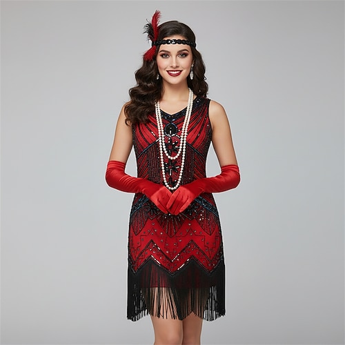 Anni Ruggenti Anni 1920 Lunghezza al ginocchio Abito Flapper Senza maniche Il grande Gatsby Ragazza Flapper Paillettes Frange Scollo a V Costume Per donna Natale Carnevale Mascherata Festa a tema