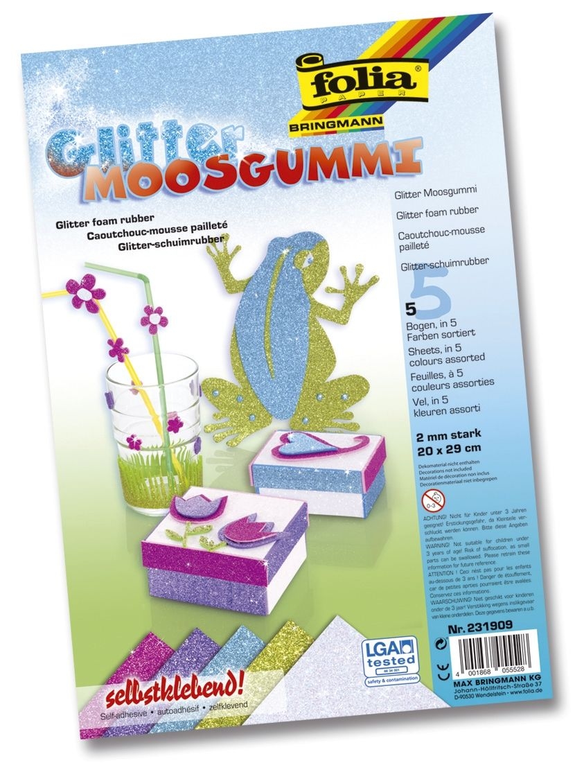 Folia 231909 Moosgummi Glitter - 20 x 29 cm, selbstklebend, 5 Farben sortiert