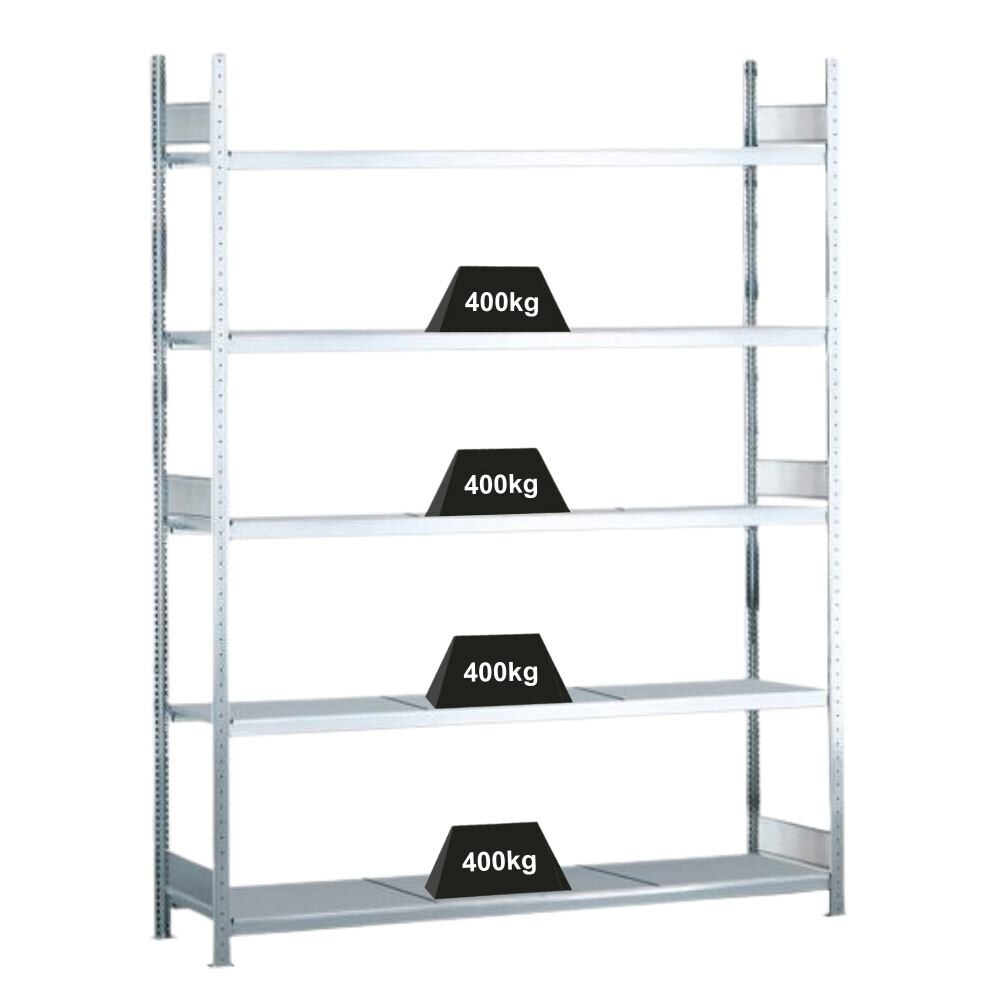 PROREGAL Weitspannregal mit Stahlböden WS 2000 | Grundregal | HxBxT 300x250x50cm | 5 Ebenen | Fachlast 400kg | Verzinkt