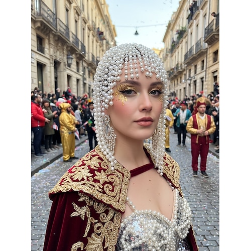 Copricapo per il Carnevale con perline di perla da donna per il Mardi Gras – Accessorio per capelli scintillante da festival con pompon di perle glamour per occasioni speciali
