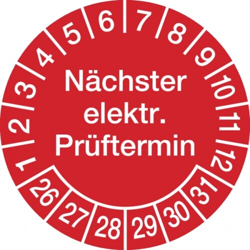 König Werbeanlagen Prüfplakette ab 26, Nächster elektr. Prüftermin, rot/weiß, Folie, Ø 30 mm - Bogen = 10 Plaketten - 30 mm Folie selbstklebend
