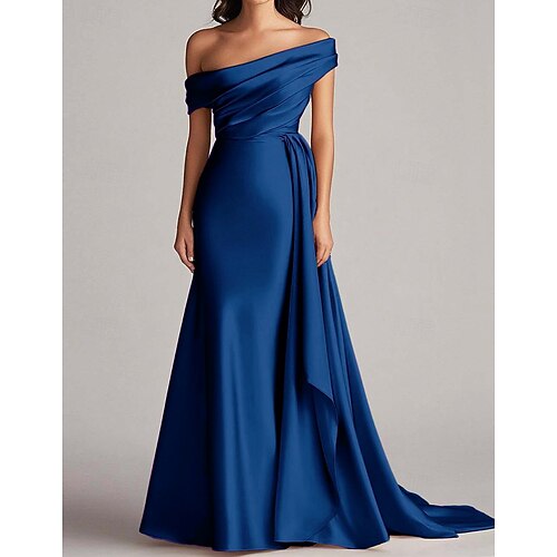 Abito da Sera A-line Seta Stretch Vestito Elegante Matrimonio Semiformale Strascico Spazzola Senza Maniche Spalle Scoperte Seta con Pieghe