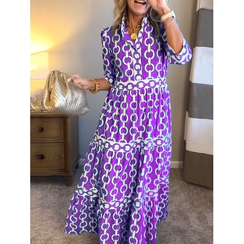 Per donna Abito maxi Abito a trapezio Vacanza Casual All'aperto Uscire Vestibilità regolare Grafico Manica Lunga Collo ripiegato Blu Nero Rosso Viola Estate Primavera Autunno