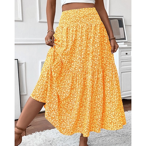 Per donna Linea A Moda Casual Maxi Vita Alta Gonne Floreale Stampato Fluido Micro-elastico Quotidiano Streetwear Blu Ametista Nero Giallo Estate Poliestere