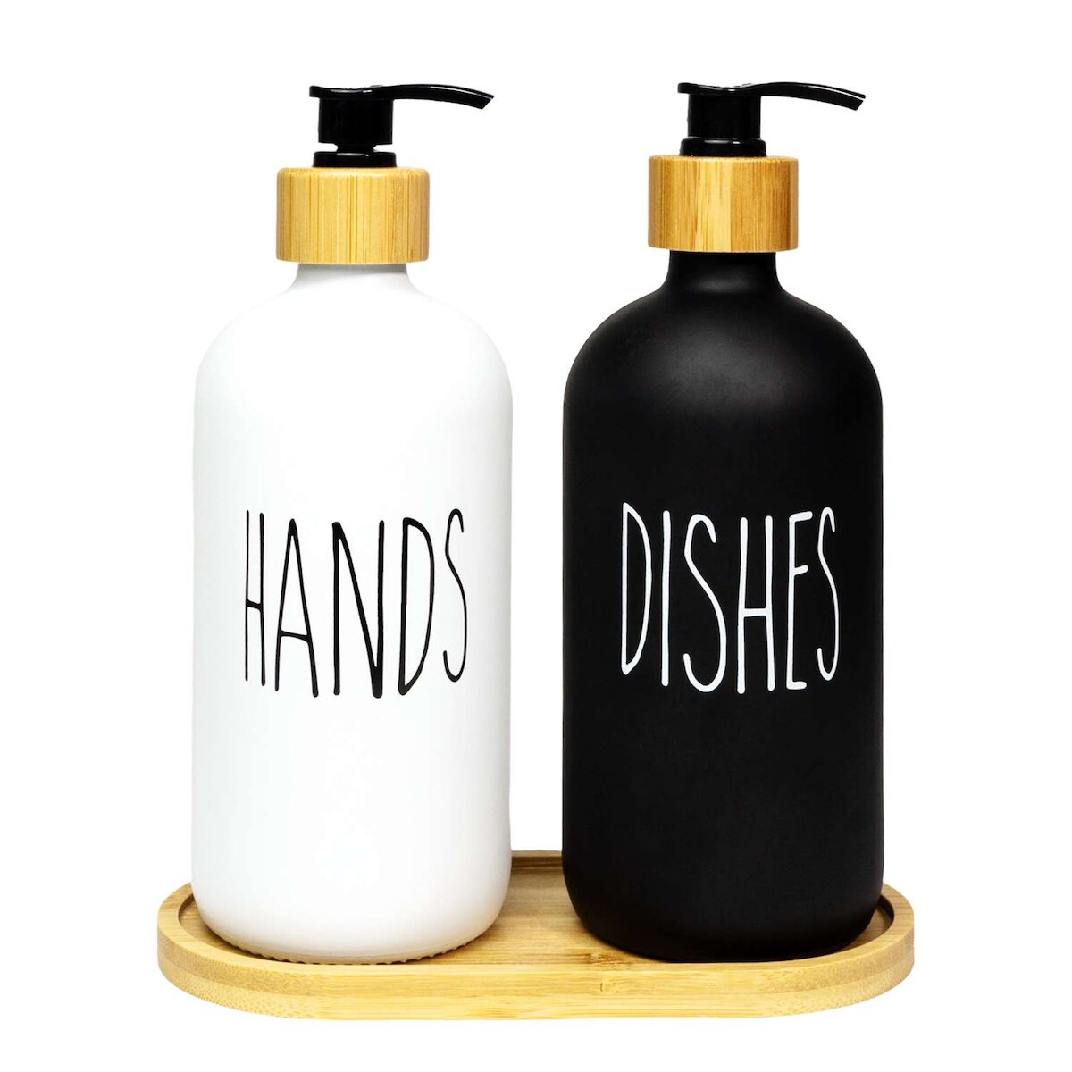 Intirilife 3-teiliges Seifenspender Set aus Glas in Schwarz - Weiß mit Bambus Tablett - 500 ml Füllmenge - 17.5 x 8.8 x 20.6 cm - 2 Spender für Seife