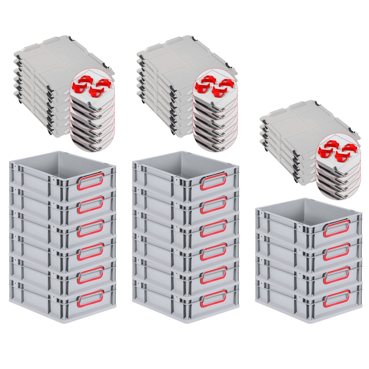 PROREGAL 16x Eurobox NextGen Color mit Auflagedeckel & Schiebeschnappverschlüsse | HxBxT 12x30x40cm | 11L | Griffe rot zu