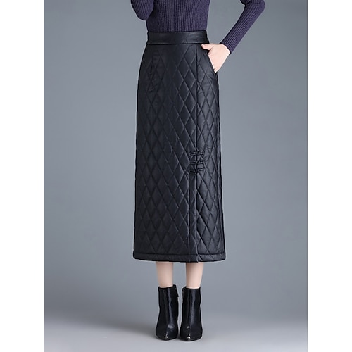 Per donna Gonna Linea A Moda Casual Midi Vita Alta Gonne Semplice Tasca Micro-elastico Streetwear Quotidiano Nero Primavera Finta pelle