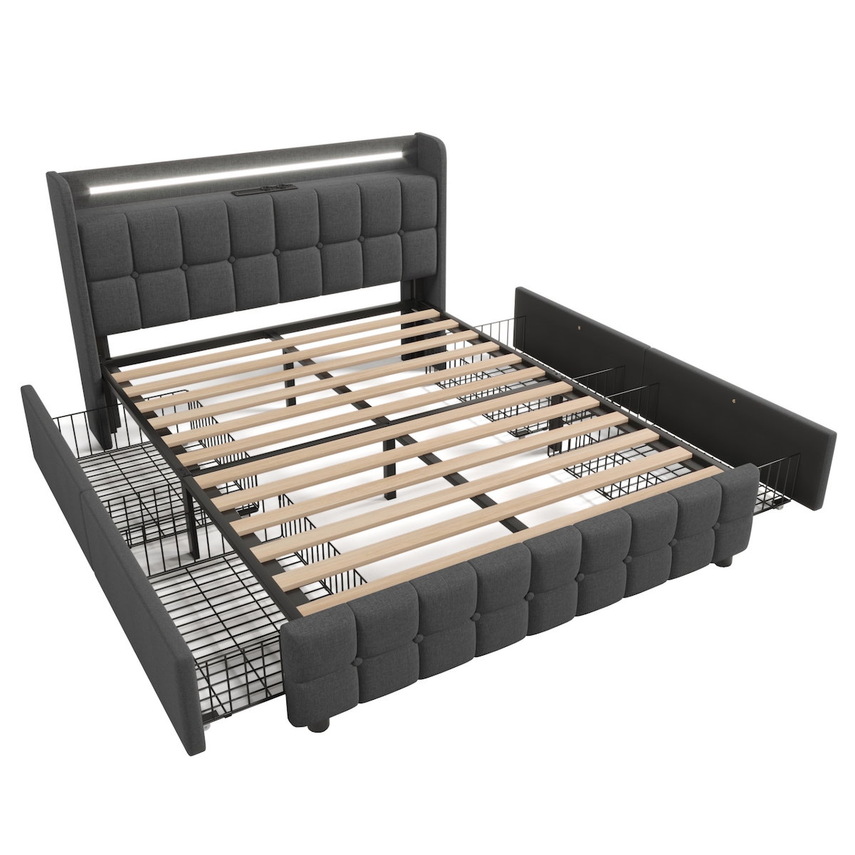 Merax LED Stauraumbett Polsterbett 180x200 Doppelbett aus Leinen mit 4 Schubladen & 2 Steckdosen & 2 USB & Lattenrost Grau