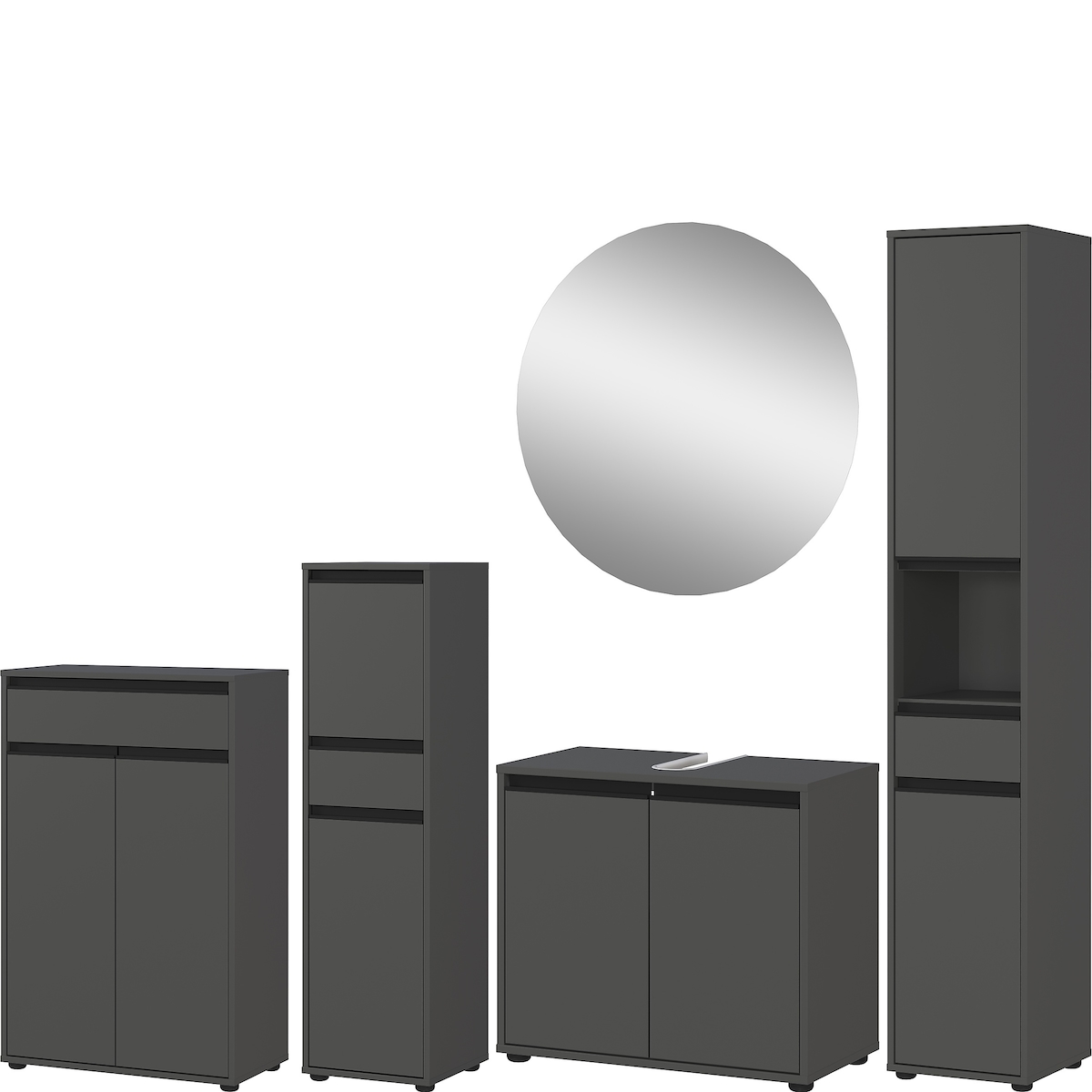 Badmöbel Set 5-tlg Soft-Close XXL | Hochschrank, Unterschrank, Midischrank, Badkommode, Runder Spiegel | Graphit | Serie HAMBURG Kadima Design
