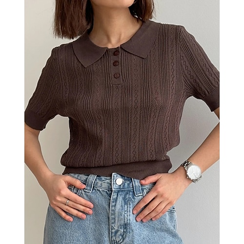 Per donna Blusa Tinta unica Essenziale Casual Manica Corta Colletto a Camicia Top Regolari Quotidiano Ferie Uscire Traforato Marrone Beige Estate Primavera