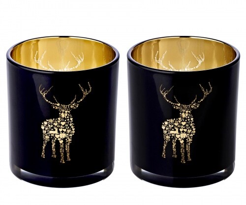 EDZARD 2er Set Teelichthalter Fancy (Höhe 8 cm, ø 7 cm), Windlicht im Hirsch-Motiv, außen schwarz/innen Gol