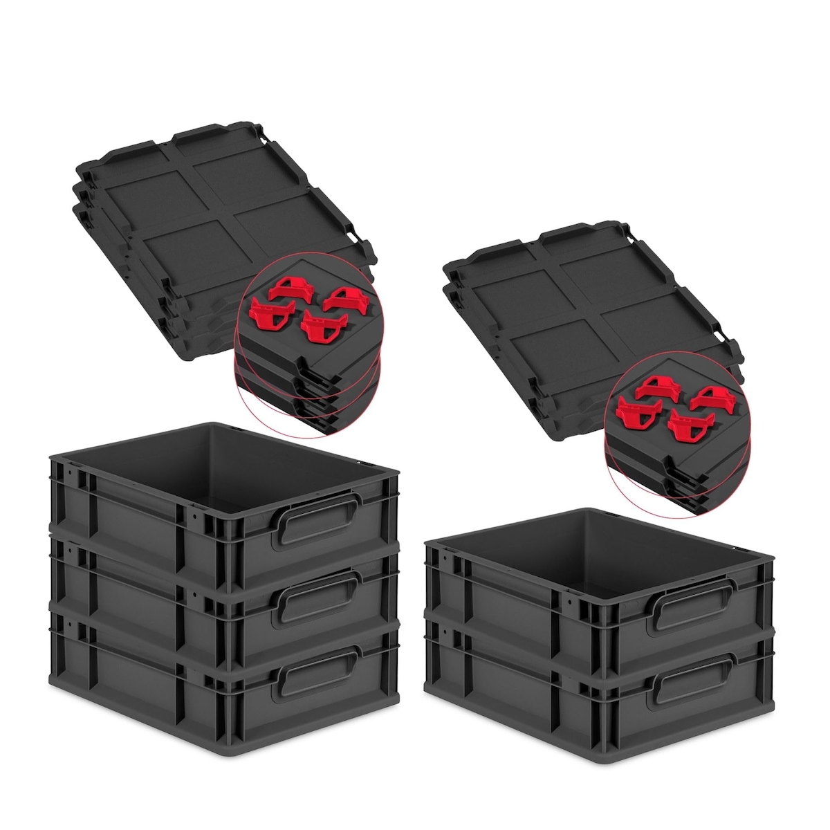 PROREGAL SparSet 5x Eurobox NextGen Grip mit Auflagedeckel & 4 roten Verschlüssen, HxBxT 12x30x40cm, 11L, Schwarz, Griffe zu, Eurobehälter