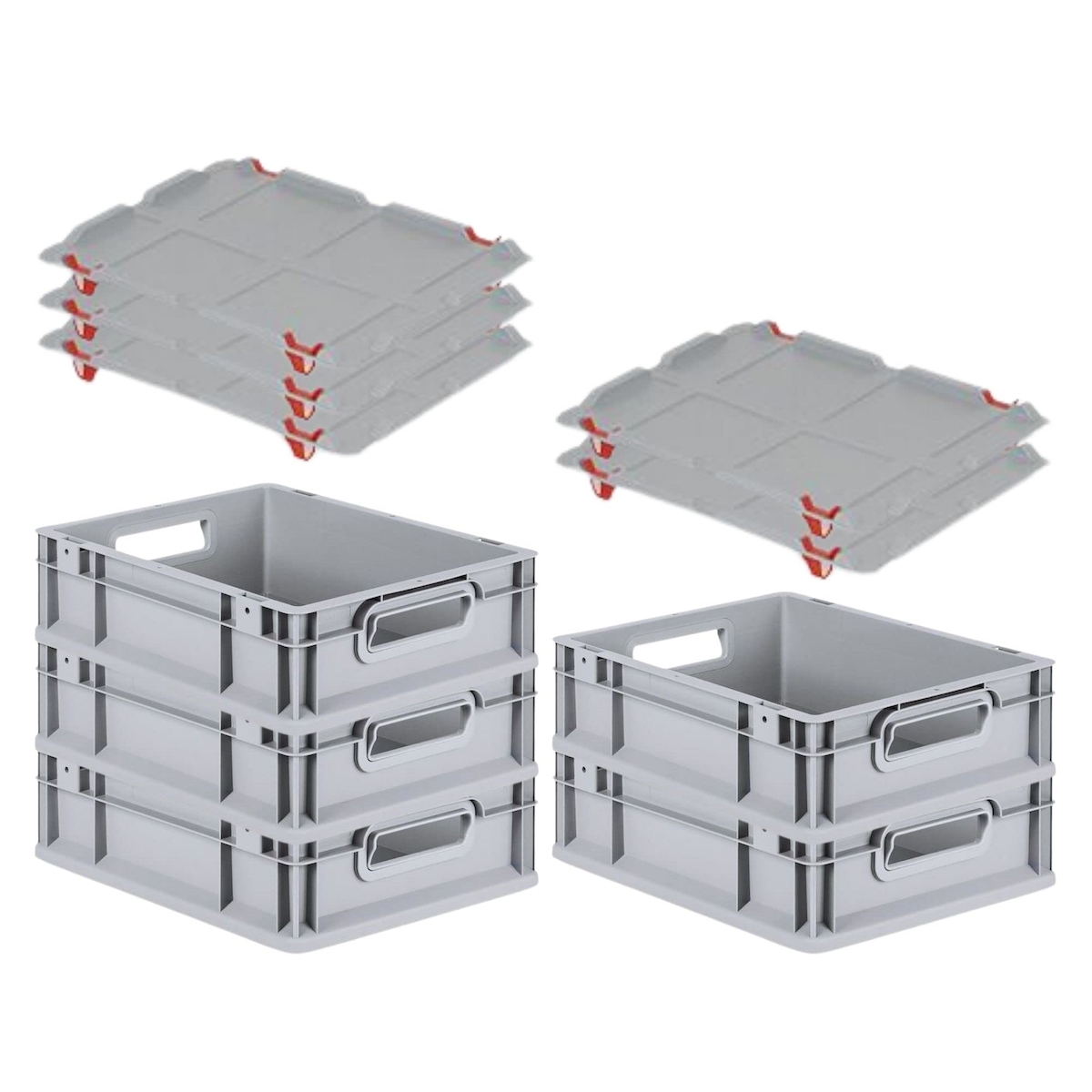 PROREGAL SparSet 5x Eurobox NextGen Grip mit Auflagedeckel & 4 roten Verschlüssen, HxBxT 12x30x40cm, 11L, Grau, Griffe offen, Eurobehälter