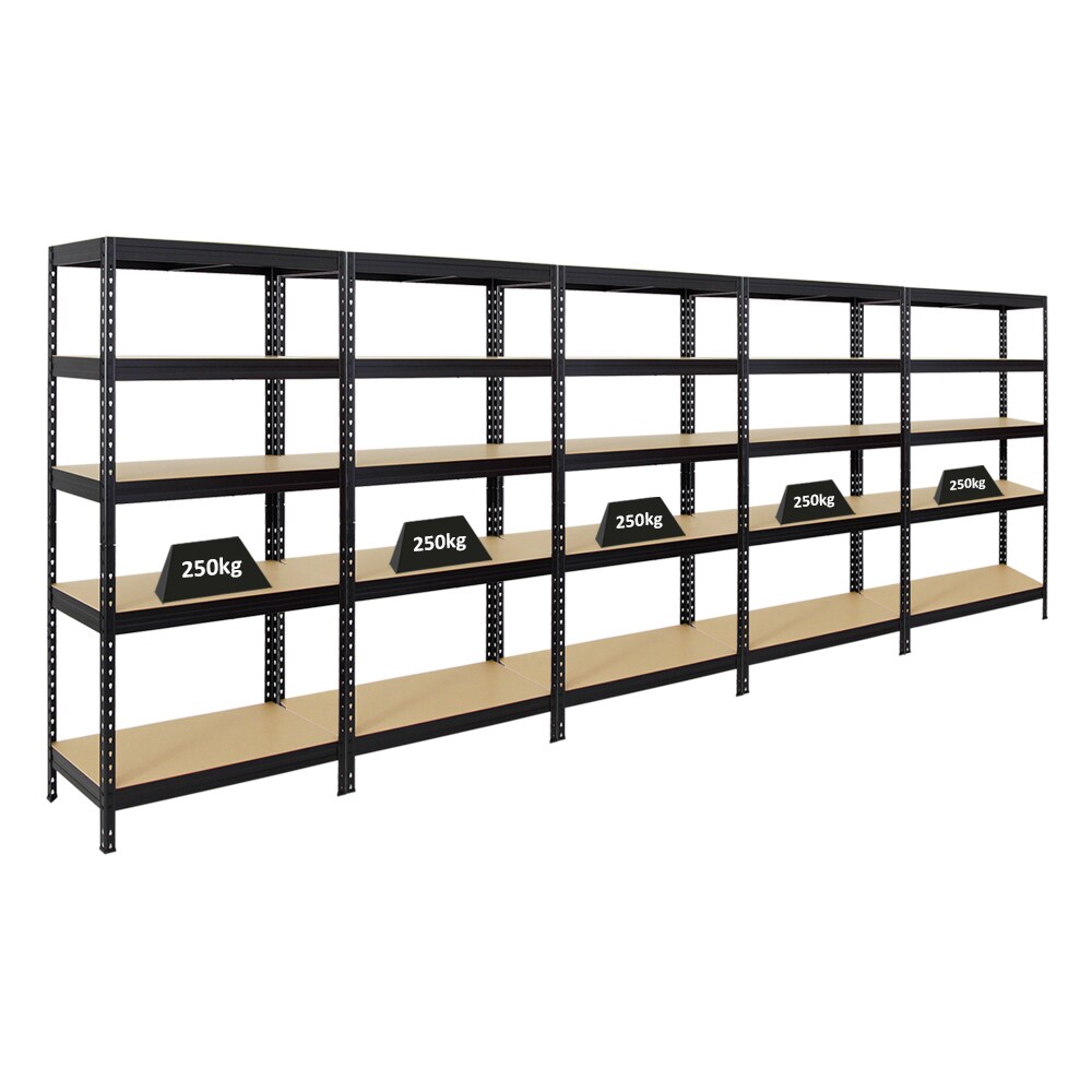 PROREGAL Mega Deal 5er-Set Schwerlastregal Rivet | HxBxT 180x90x45cm | Fachlast 250kg | Schwarz | Innovatives Stecksystem, Lagerregal, Kellerregal