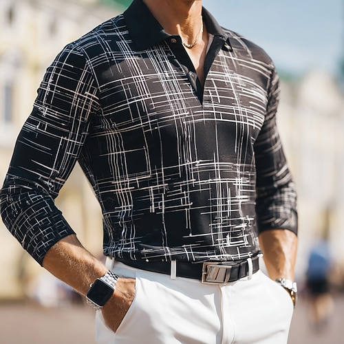 Per uomo A righe Geometrico Polo da rugby Manica Lunga Magliette polo Bavero Business Casual Athleisure Abbigliamento quotidiano Stampa 3D Bottoni Primavera Autunno Inverno Nero Bianco
