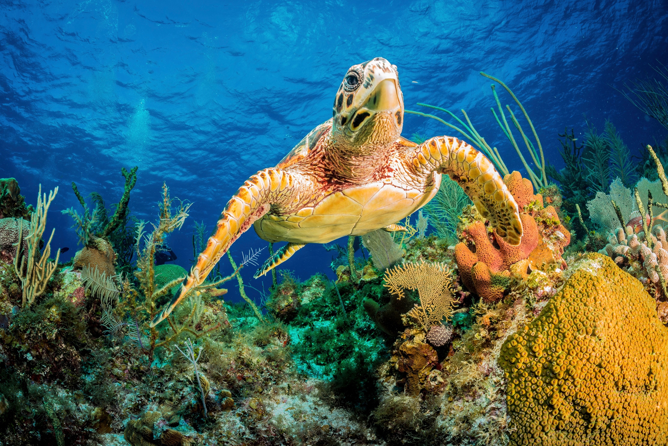 Fototapete PAPERMOON "JAN ABADSCHIEFF, HAWKSBILL TURTLE SCHWIMMEN DURCH KARIBISCHES RIFF", bunt, B:5,00m L:2,80m, Vlies, Tapeten