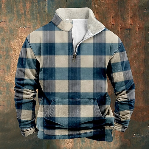 Per uomo Maglia Felpa in pile Felpa con zip corta Blu Arancione Marrone Cachi Marrone 2 Mezza zip Geometrico Plaid Zip a un quarto Sport Outdoor Quotidiano Ferie Poliestere Streetwear Essenziale