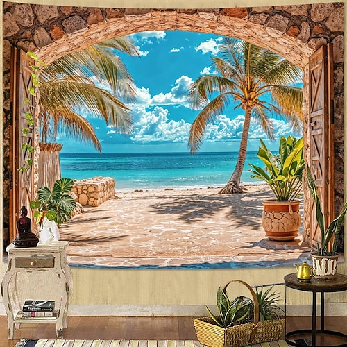 arazzo con finestra, paesaggio, spiaggia, oceano tropicale, palma, mare, sfondo da parete, murale estivo per soggiorno, camera da letto, ufficio, arredamento