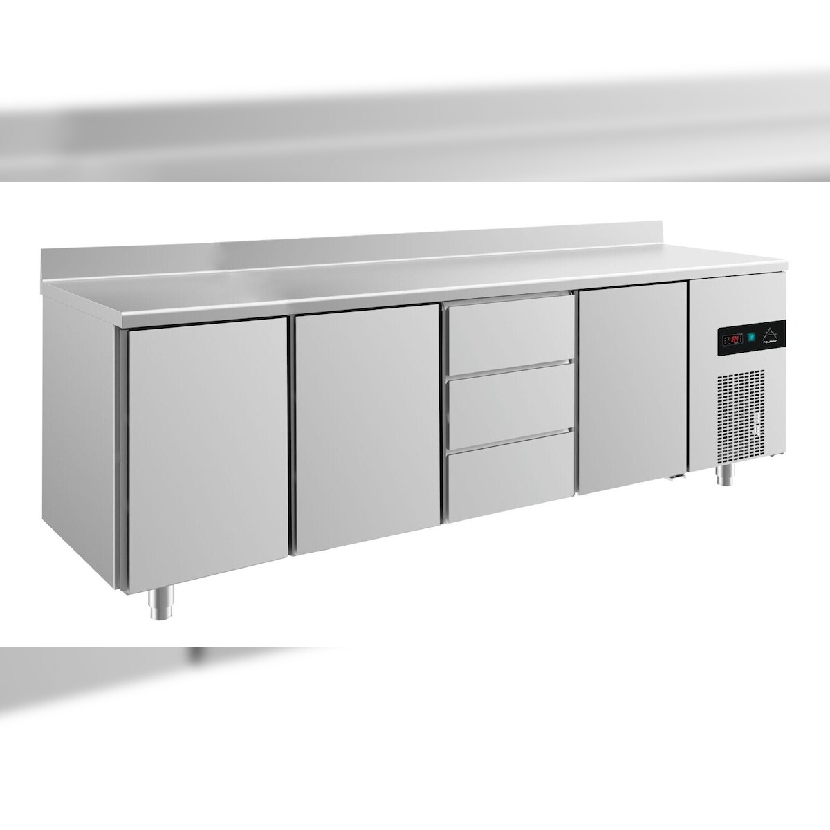 Gastro Kühltisch 3 Türen links&mittig&rechts 3 Schubladen mittig Umluftkühlung Aufkantung, 2330x700x850mm -2/+8°C