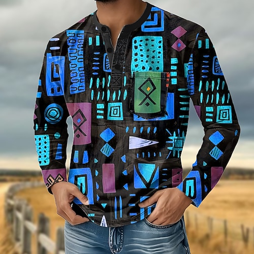 Per uomo Arcobaleno Geometrico Maglia Henley Maglietta a nido d'ape Manica Lunga Vintage Quotidiano Retrò Vintage Sport all'Aperto Casuale Ferie Primavera Estate Tutte le stagioni Marrone Scuro Blu