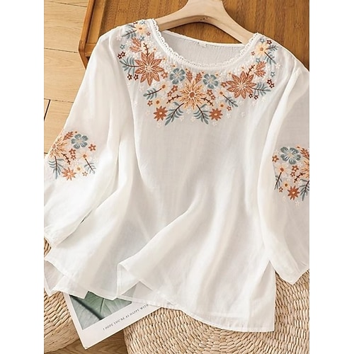 Per donna Blusa Floreale Elegante Casual Manica 3/4 Girocollo Top Regolari Quotidiano Ricamato Bianco Rosa Viola Estate Primavera Autunno