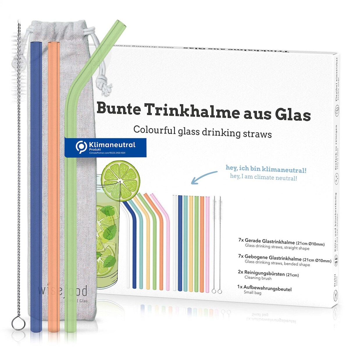 WISEFOOD 14 Halme + 2 Bürsten (1 Set) - Glas Trinkhalm Set bunt: 14 Halme + 2 Bürsten