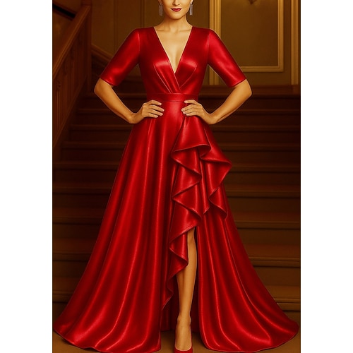 Linea ad A Lunghezza al pavimento Abito da Sera Da principessa Abito formale Elegante Mezza Manica Scollo a V Matrimonio Formale Raso con Pieghe Volant