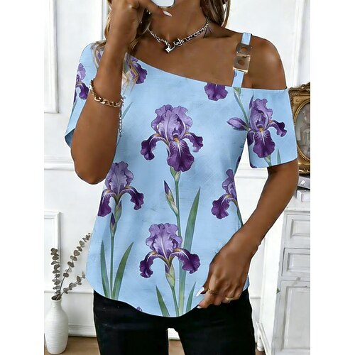Per donna Maglietta Stampato Floreale Grafico Elegante Classico Casual Manica Corta Collo asimmetrico Top Regolari Quotidiano Uscire Weekend Blu Giallo Rosa Estate Primavera