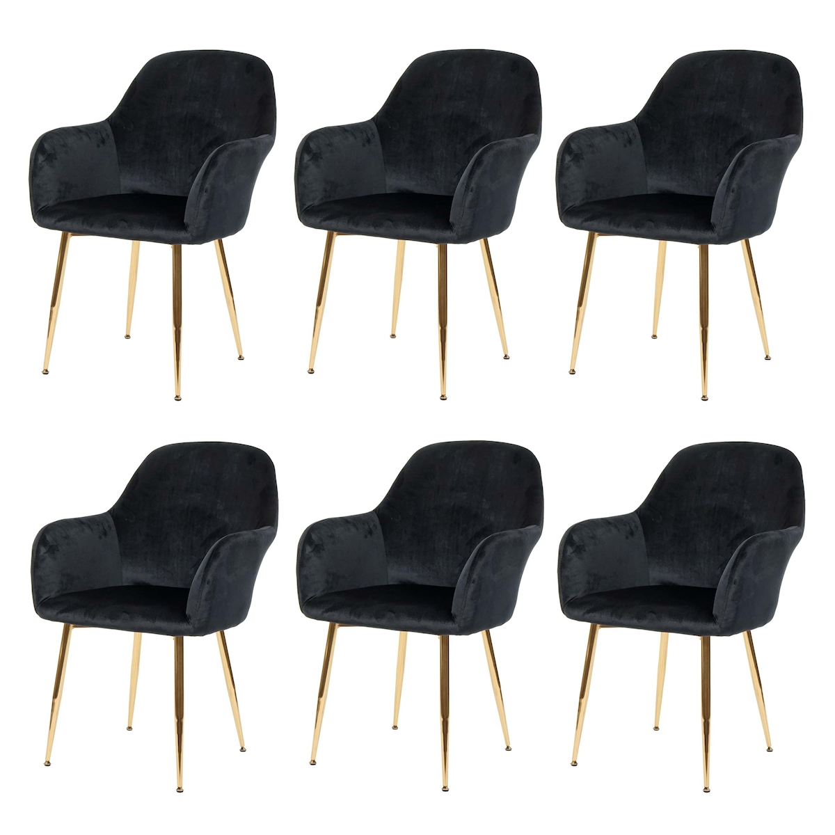 Mendler 6er-Set Esszimmerstuhl HWC-F18, Stuhl Küchenstuhl, Retro Design ~ Samt schwarz, goldene Beine