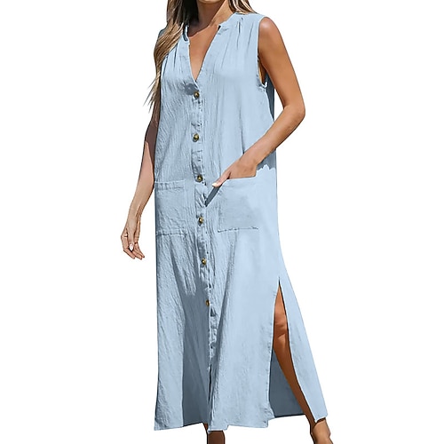 Per donna Abito Midi Vestito Casual Abito in cotone e lino Elegante Moda Moderno Quotidiano Vacanza Uscire Vestibilità comoda Semplice Senza Maniche Scollo a V Nero Blu marino Azzurro Estate Primavera