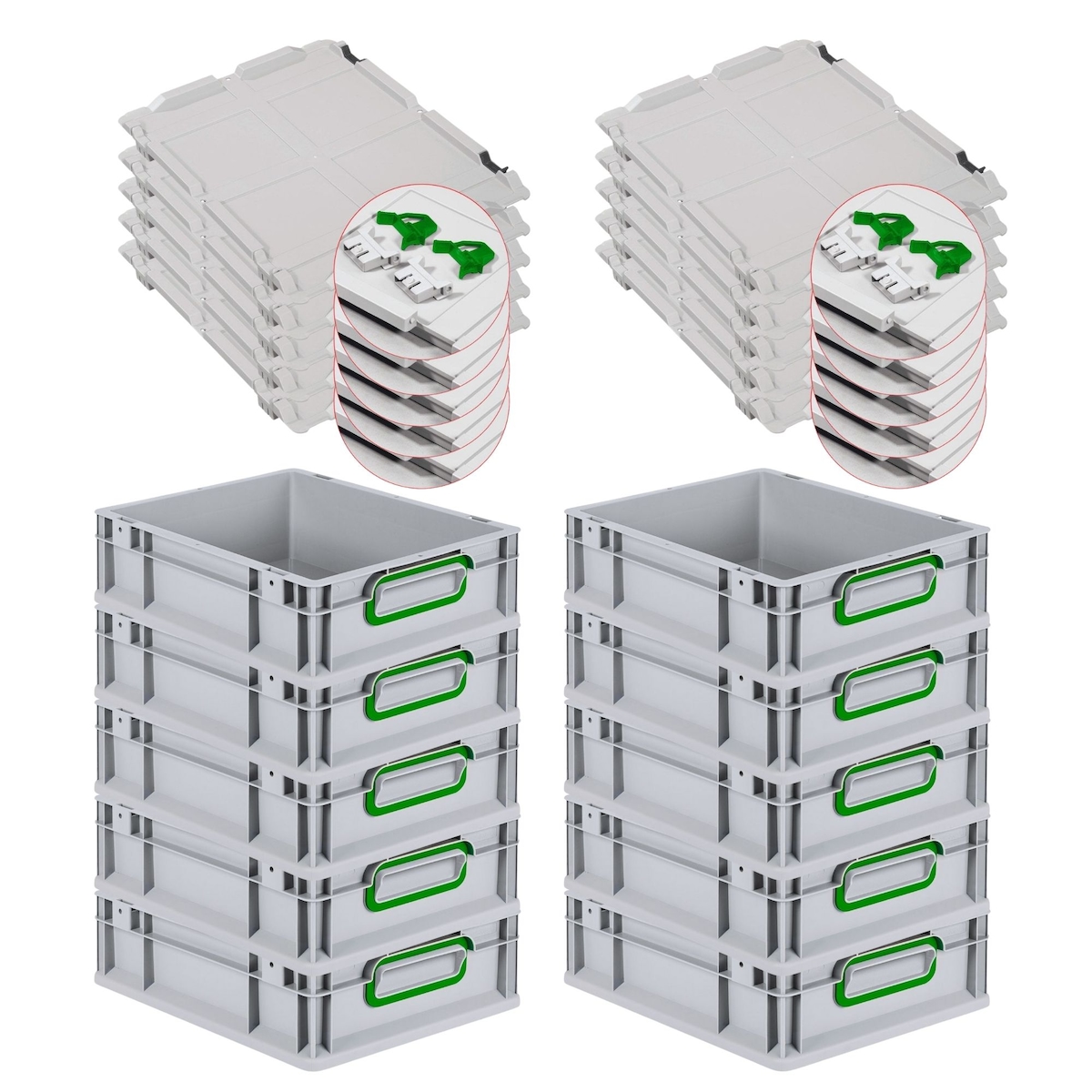 PROREGAL 10x Eurobox NextGen Color mit Scharnierdeckel & Verschlüssen | HxBxT 12x30x40cm | 11 Liter | Griffe grün geschlossen | Glatter Boden