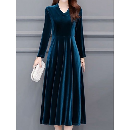Abito Midi in Velluto per Donna Abito A-line Elegante Festa Cocktail Festa Matrimonio Ospite di Matrimonio Vestibilità Regolare Colore Unito Maniche Lunghe Scollatura a V Nera Vino Blu Viola Autunno