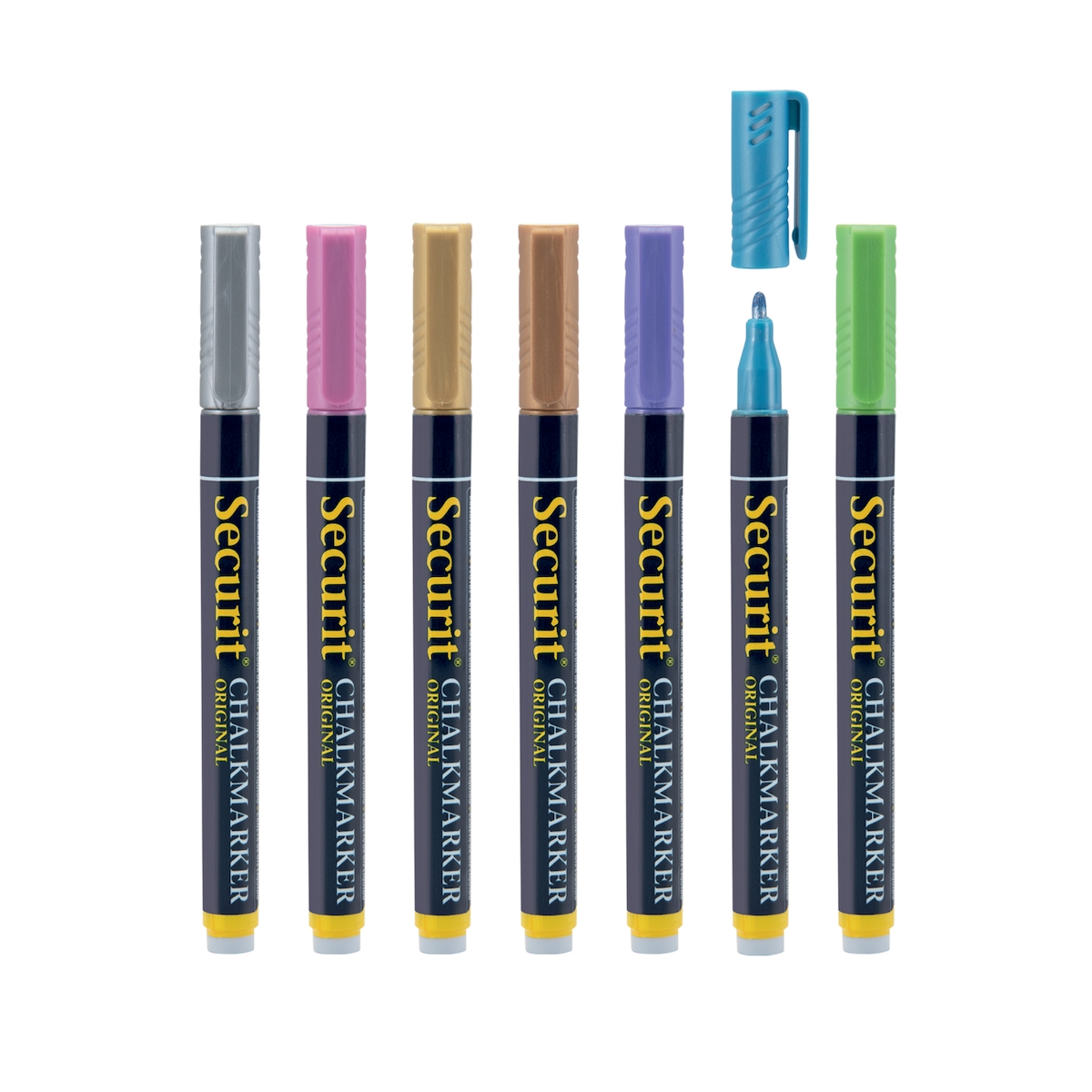 Securit® Set von 7 Flüssigkreidestiften in metallischen Farben grün, blau, violett, rosa, bronze, gold und metall mit 1-2mm Keilspitze