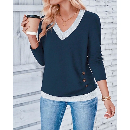 Per donna Blusa Semplice Elegante Casual Manica Lunga Scollo a V Top Regolari Quotidiano Uscire Weekend Patchwork Bottoni Nero Bianco Blu marino Blu turchese Autunno