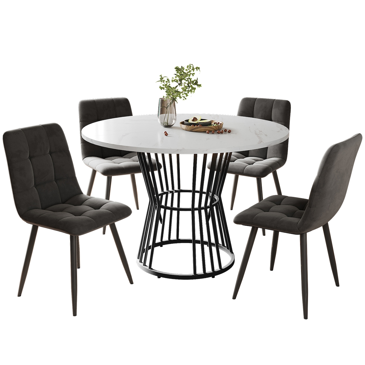 OKWISH Esstisch-Set (5-teilig) mit rundem Tisch 100x100x75 cm, schwarzen Metallbeinen und dunkelgrau Samtstühlen