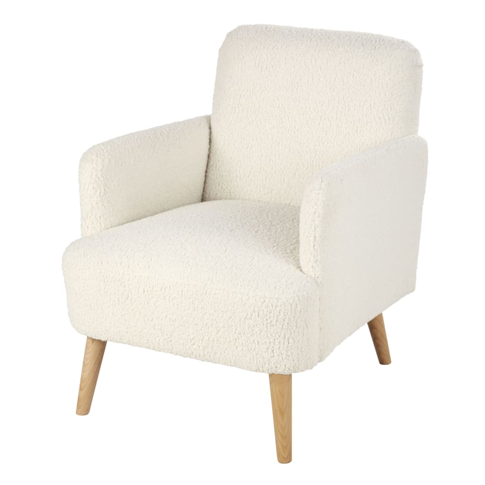 Fauteuil bouclettes blanches et pieds en bois de hêtre