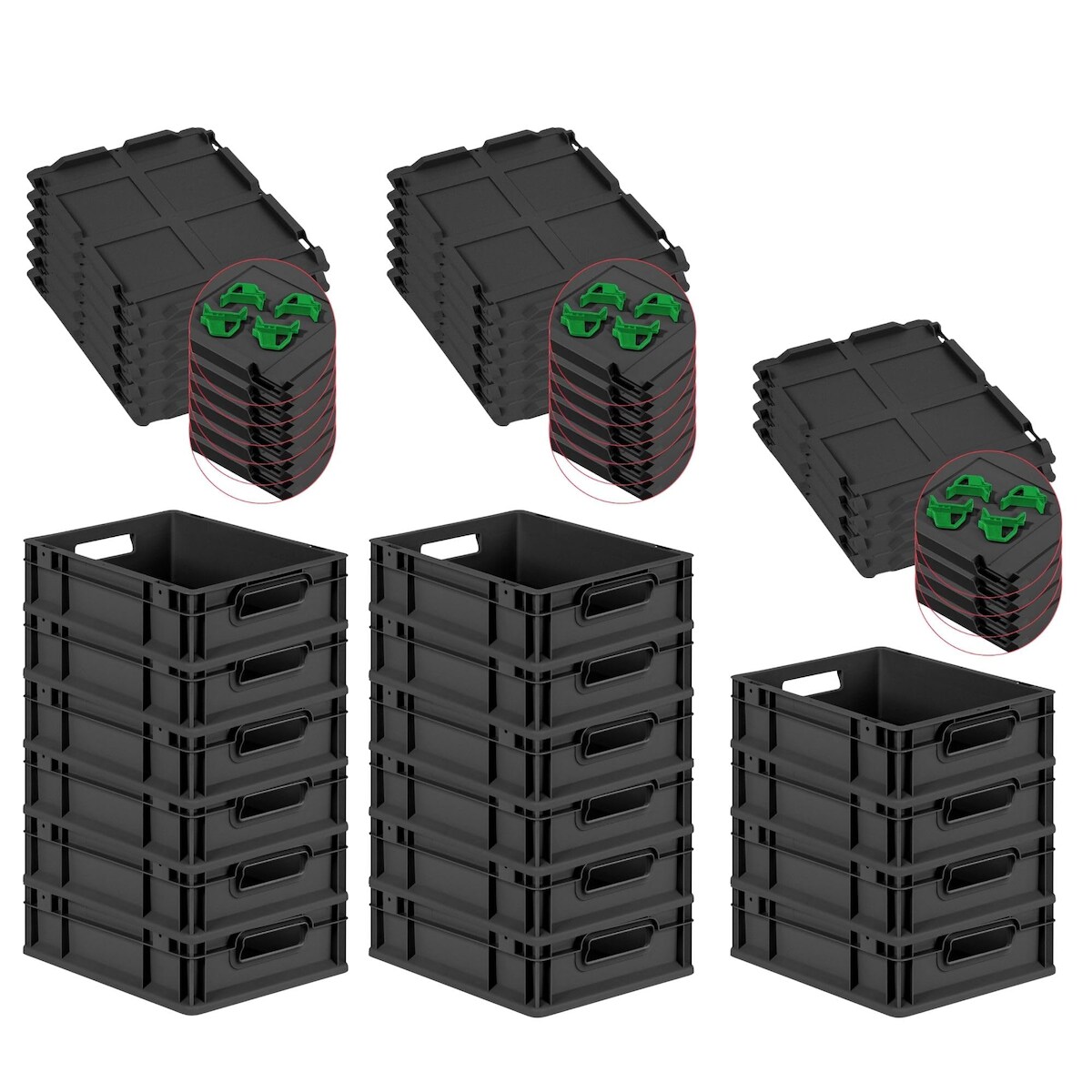 PROREGAL SuperSparSet 16x Eurobox NextGen Grip mit Auflagedeckel & 4 grünen Verschlüssen, HxBxT 12x30x40cm, 11L, Schwarz, Griffe offen, Eurobehälter